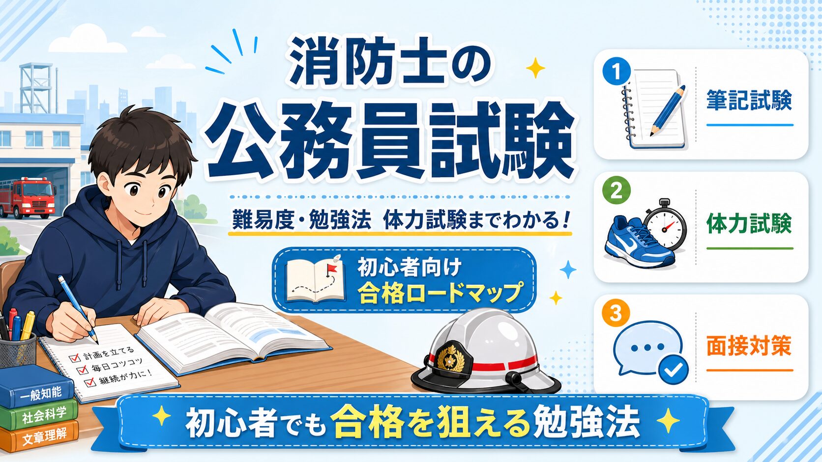 消防士の公務員試験は、筆記・体力・面接をバランスよく見られる 「総合力型」の試験です。 ただし、正しい順番で対策すれば、初学者でも十分に合格を狙えます。